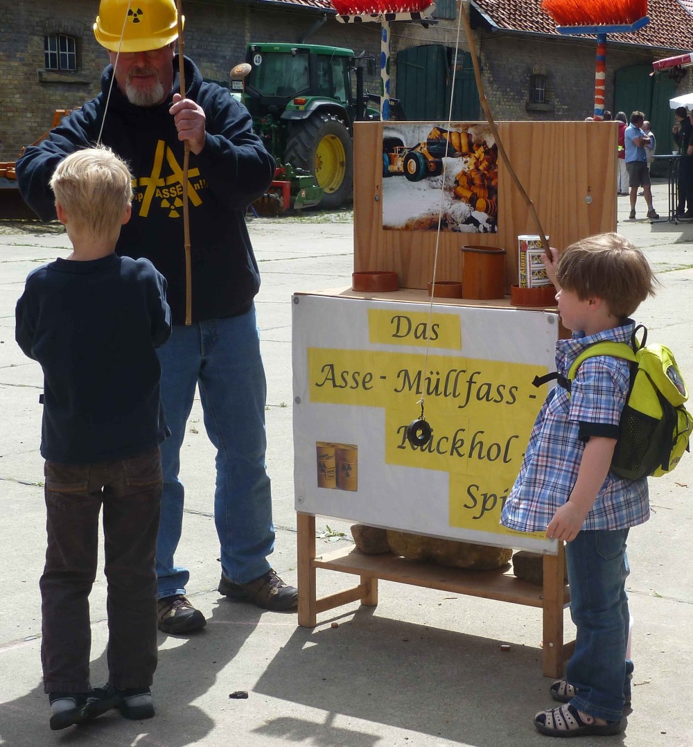 "Das ist ja fast ein Heimspiel" stellten die Mitglieder der BASA fest, die den ganzen Tag bei angenehmen Sommerwetter den Tag des Offenen Hofes in Evessen nutzten, um Unterschriften für die Asse-Alarm-Kampagne zu sammeln. "Flutung der Asse - das darf nicht sein - na klar, unterschreibe ich" bekamen die fleißigen Sammlerinnen und Sammler häufig als Antwort. Und dies hat sich ausgezahlt, knapp 600 Unterschriften konnten zum Abschluss des Tages die doch etwas erschöpften SammlerInnnen zufrieden feststellen. Auch am Start: Das "Asse-Müllfass-Rückhol-Spiel" (s. Foto).